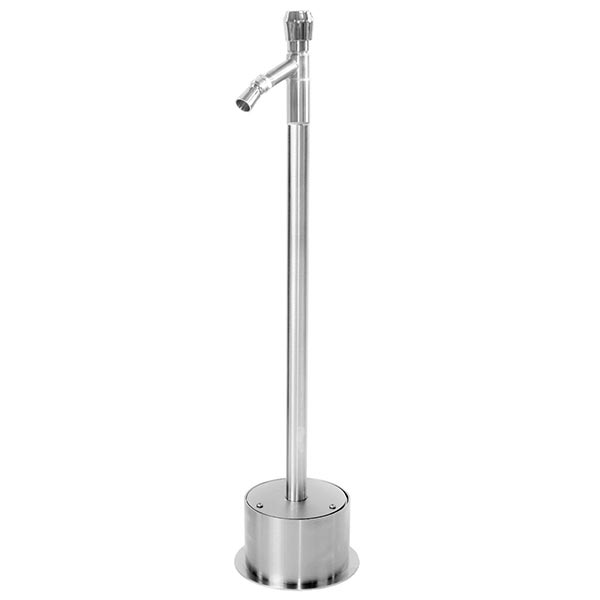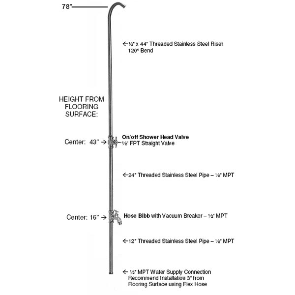 A.These great pool and beach showers come with 1/2" x 12" stainless steel flex hose. They are connected by using standard 1/2" pipe. The water line should protrude about 1 1/2" out of the ground. Then it's simply a matter of connecting the two with a stainless steel braided hose. View stainless braided water supplies.