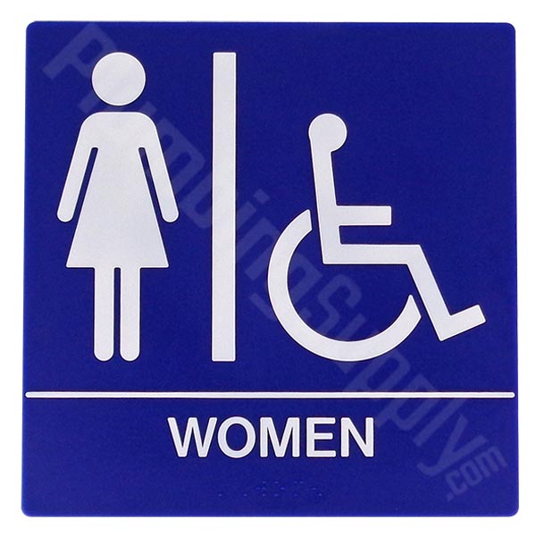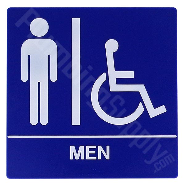 These square restroom signs include the handicap symbol to make it clear that the bathroom is fully accessible and standard grade two Braille lettering for accessible identification.