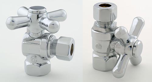 Most angle or straight stops come in a compression or 1/4-turn style. A 1/4-turn valve is simply one that is activated with a quarter turn of the handle, rather than one or several full rotations like a compression valve. Usually ball valves, these are not designed for throttling, just quick, convenient shut-off for fixtures like toilets and sinks.
