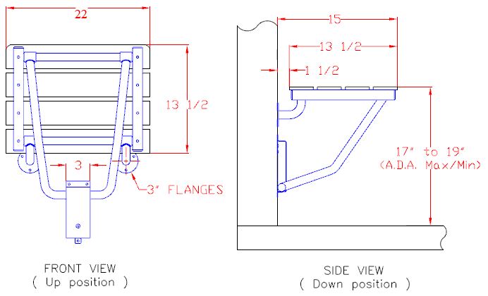 A. When properly installed, all Seachrome shower seats have been designed and manufactured to support loads exceeding the downward pull requirements for Federal specifications FHA, VA, HUD, hospital codes, and private construction. These compact folding seats are rated for a maximum of 250 lbs. The actual "in use" load bearing capacity of any shower seat, however, will be limited by the strength of its mounting surface and installation hardware. Seachrome recommends that shower seats be installed using 2" minimum thickness "in wall" solid wood backing material with #10 x 2" stainless steel, phillips-head, sheet metal screws, or using a wall embedded, minimum 12 ga. (2.8mm) steel anchor plate with #10 x 24 stainless steel machine screws. Please contact the factory for further mounting recommendations. Under no circumstances should any shower seat be mounted to drywall, sheetrock, plaster, fiberglass, acrylic or other similar "hollow" wall surfaces without appropriate wood or steel backing material. Read more information about the ADA.