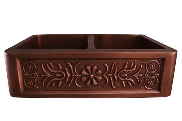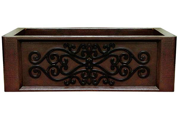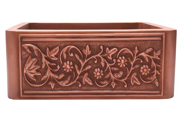 Soci Isabella single bowl copper farmhouse sink with scrollwork design