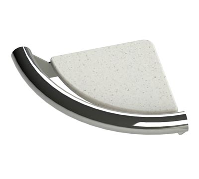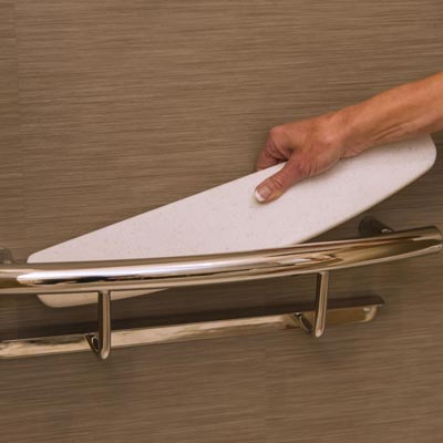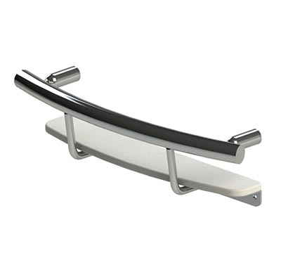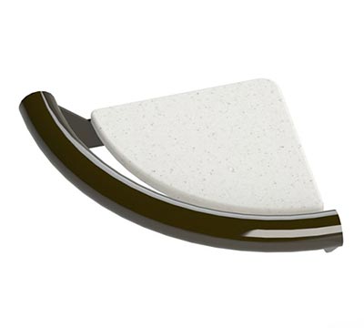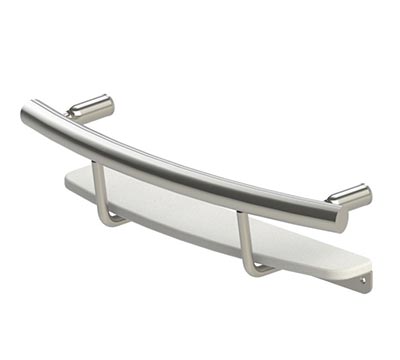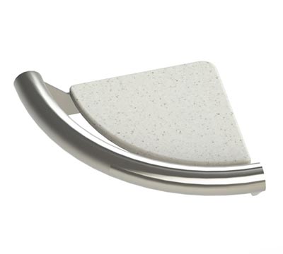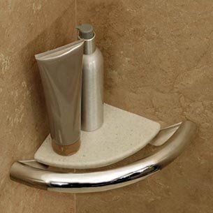 - Function and beauty unite in a compact corner shelf with curved grab bar for safety
