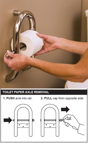 - Inconspicuous design integrates a grab bar and toilet tissue holder in one