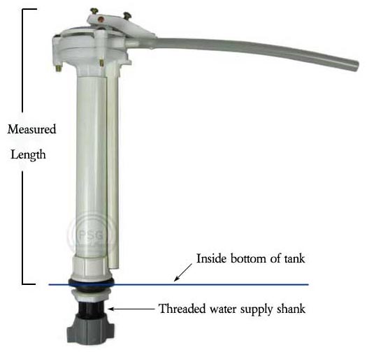 When the fill or flush valve is the culprit, turn the water supply off and remove the valve from the tank to obtain proper measurements. It's highly unlikely, but give the valve a good looking‐over to see if there happens to be a model number somewhere on it. Measure a fill valve's height as shown below, from where it mounts to the tank to its top. You'll also want to measure the depth of the tank itself, from the bottom interior. This will help determine the proper size for a universal fill valve, should the original no longer be available.