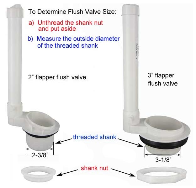 Then, look around the tank walls for a "fill line" — this is usually indicated in some way, and helps determine the height of the flush valve. If you don't see anything, look for the lowest spot where water could potentially come out of the tank: most of the time, this is where the trip lever goes in. Measure from the bottom of the tank to that point: this is the maximum water depth, which can be important when determining the height of a universal flush valve. Alternatively, you can just measure the height of your existing valve if you still have it. Do this the same way you would for the fill valve, starting from where the flush valve mounts in the tank to the very top of the overflow tube. Finally, measure the outside diameter of the valve, as shown below, or the hole into which the valve is placed in the tank.