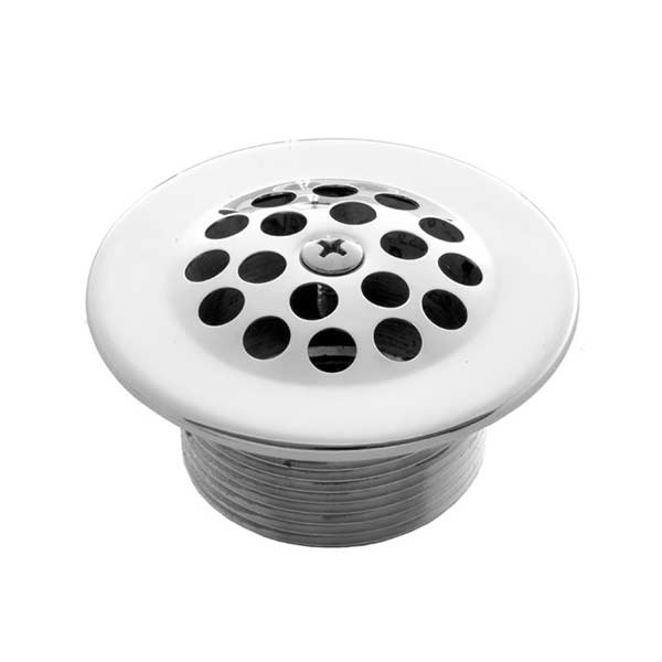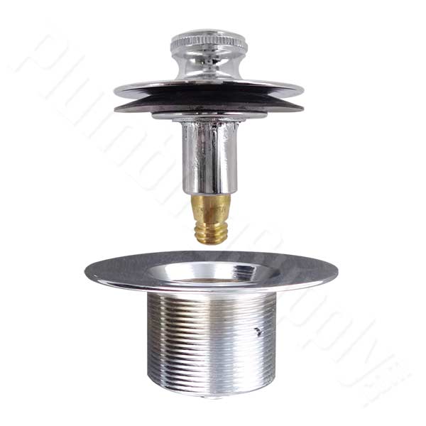 Plunger tub drains have a stopper located inside the waste and overflow pipe, and are activated using a Trip Lever or Turn Style overflow plate. Most will have a strainer plate covering the drain. The cover plate simply screws into the body of the drain, as shown in this example, and can be removed or changed by just unscrewing it.