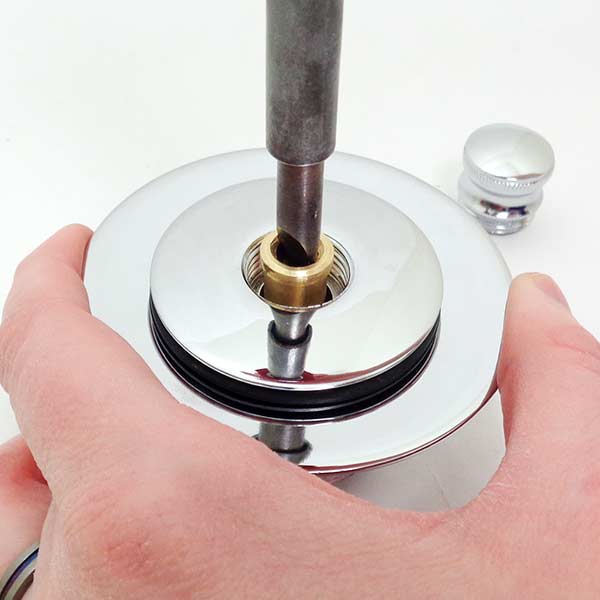 If your stopper does not have a visible set screw on the stopper knob and does not unscrew then you may have one of two different styles of lift and turn stoppers. One will have a set screw beneath the stopper on the post shaft. With the stopper still in the "open" position, lift the stopper up. Turn it until you see a small screw. This will be the "set" screw and you can now proceed to Step 3.