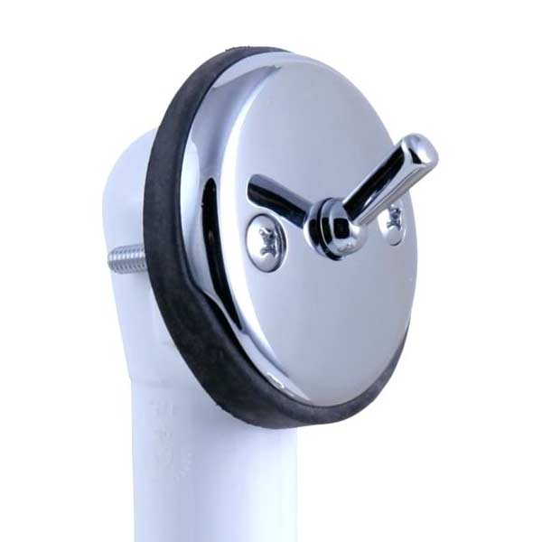 • Pop-Up: This style can have a trip lever or turn style mechanism on the overflow that moves an internal push rod against a rocker arm attached to the stopper to raise or lower the stopper. Pop-ups have a visible stopper in the tub drain, and cannot be covered by a strainer.