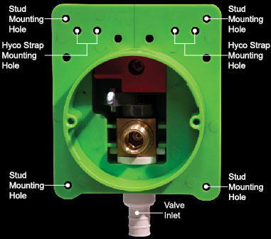 - Pre-drilled holes in mounting box for stud or Hyco strap mounting
