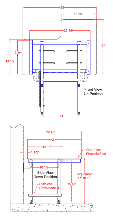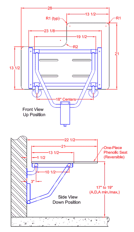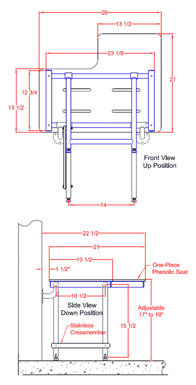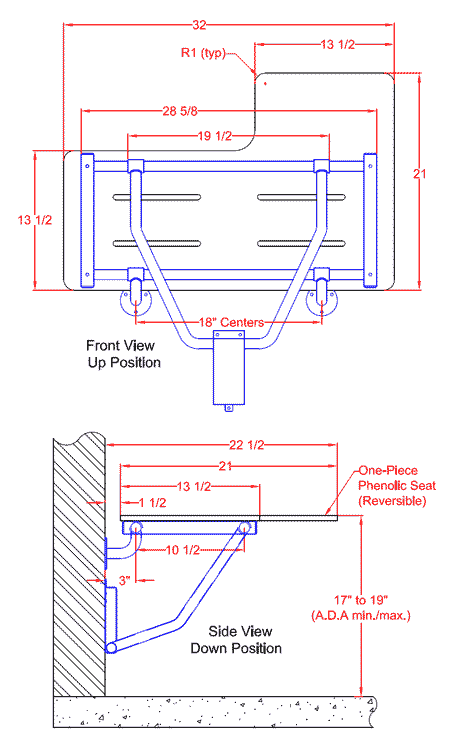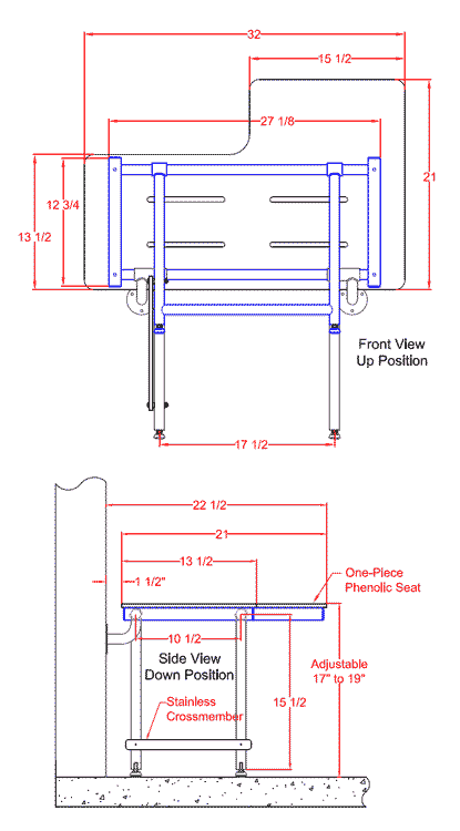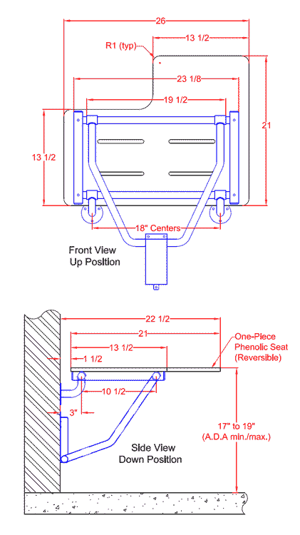 A. When properly installed, all Seachrome shower seats have been designed and manufactured to support loads exceeding the downward pull requirements for Federal specifications FHA, VA, HUD, hospital codes, and private construction. Reversible L-Shaped shower transfer seats are rated for 250 lbs. maximum weight. Reversible L-Shaped shower transfer seats WITH swing down legs are rated for 900 lbs. maximum weight. The actual "in use" load bearing capacity of any shower seat, however, will be limited by the strength of its mounting surface and installation hardware. Seachrome recommends that shower seats be installed using 2" minimum thickness "in wall" solid wood backing material with #10 x 2" stainless steel, phillips-head, sheet metal screws, or using a wall embedded, minimum 12 ga. (2.8mm) steel anchor plate with #10 x 24 stainless steel machine screws. Please contact the factory for further mounting recommendations. Under no circumstances should any shower seat be mounted to drywall, sheet rock, plaster, fiberglass, acrylic or other similar "hollow" wall surfaces without appropriate wood or steel backing material.
