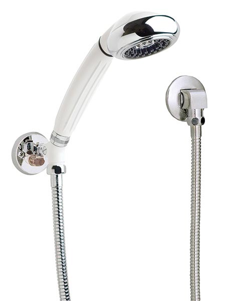 - Open flow hand shower featuring a comfortable rubber grip, flexible 5' metal hose for extra reach, in-line vacuum breaker to prevent water from siphoning back into the shower, and a swivel wall bracket, wall connection & flange for easy installation
