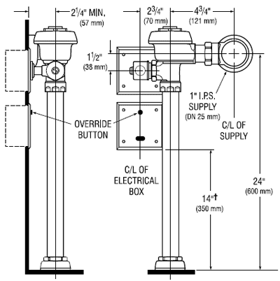 Concealed flushometer for 1-1/4" back spud urinal 2-3/4" to 10-3/4" LDIM - dimensions - 3.5 GPF |