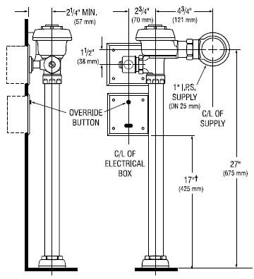 Concealed flushometer for 1-1/4" back spud urinal 2-3/4" to 10-3/4" LDIM - dimensions - 1.5 GPF |