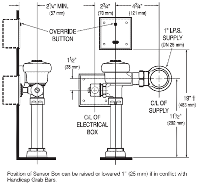 Concealed flushometer for 3/4" back spud urinal 2-3/4" to 10-3/4" LDIM - dimensions - 1.0 GPF |