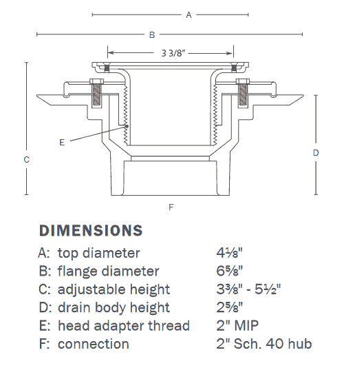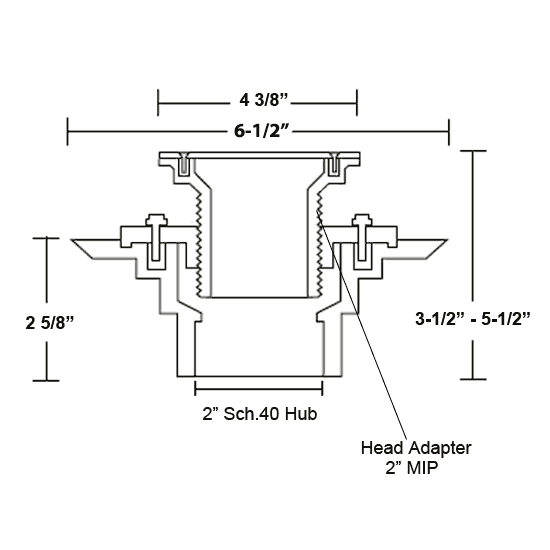 - 2" FIP thread clamping collar; 2" MIP top housing, & 2" glue on hub outlet