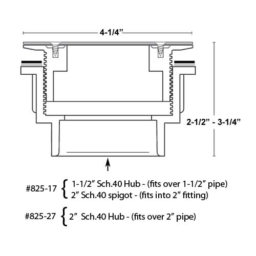 1-1/2" hub or 2" Spigot solvent weld outlet - snap-in strainer -