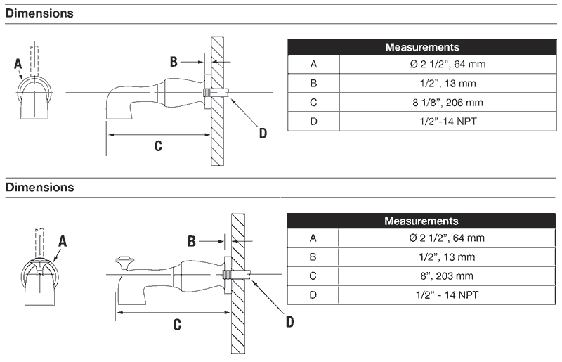- View Degas Diverter and Non-Diverter tub spout dimensions