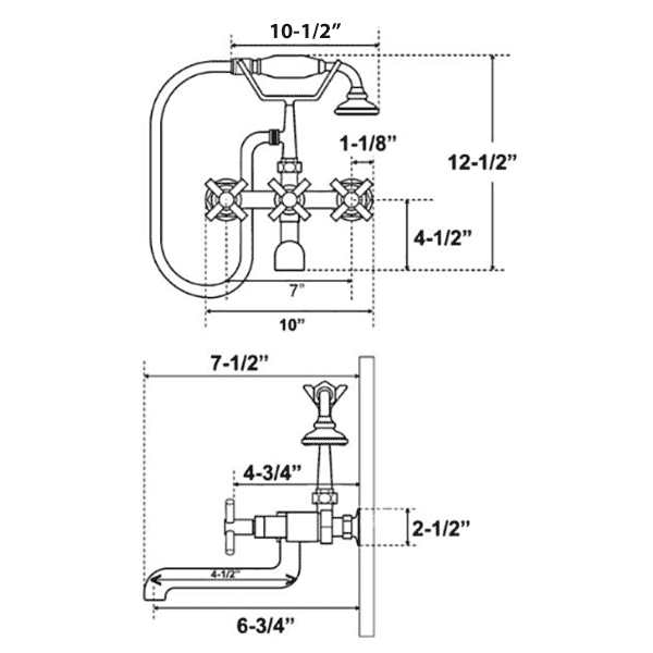 7" Spread Wall Mount Leg Tub Faucet With Hand Shower