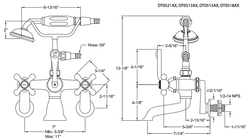 7" Spread Wall Mount Tub Faucet with Hand Shower